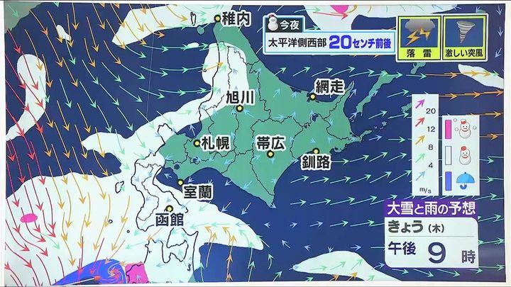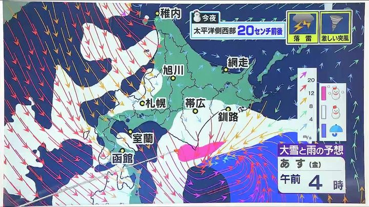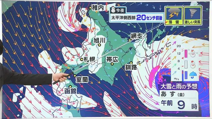 今後は低気圧が北海道の南を通るため、太平洋側を中心に雪や風が強まり、あす17日朝までに渡島や日高地方の多いところで20センチ前後の雪が降ります。大気の状態も不安定になるので、落雷や竜巻などの激しい突風にも注意して下さい。