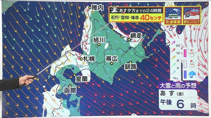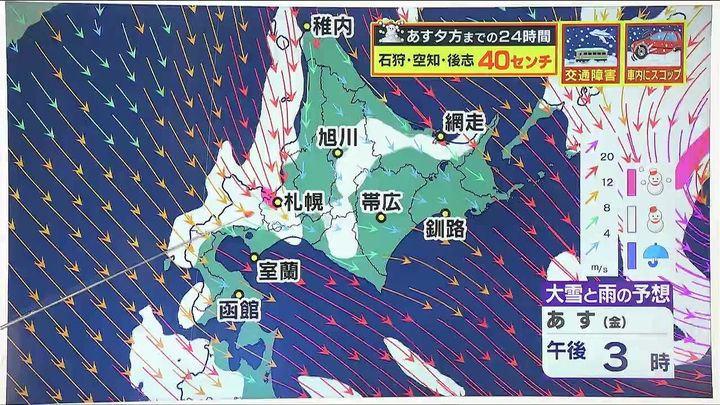 石狩や空知、後志地方では、低気圧による雪雲と北風による雪雲の「ダブルパンチ」になって、夕方までの24時間に多いところ40センチ、夜以降もさらに雪が増えそうです。