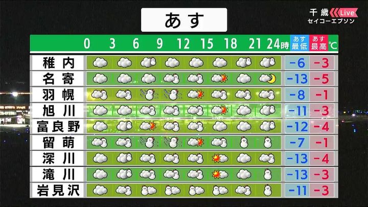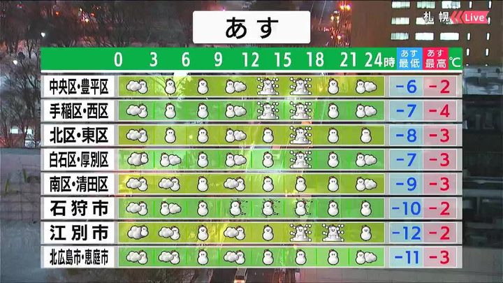 留萌地方では午前中と夜を中心に雪や風が強まり、20センチ前後の雪が降りそうです。岩見沢周辺でも断続的に雪が降るでしょう。