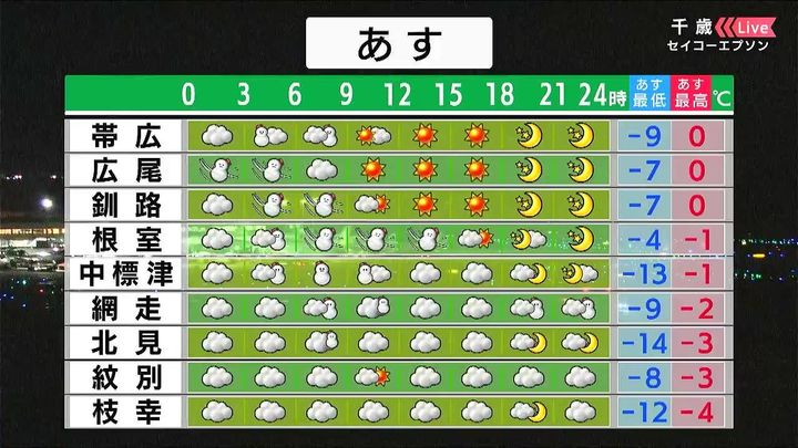 十勝や釧路は朝まで、根室は昼頃まで雪や風が強まります。朝はうっすら積もるため、路面凍結に注意して下さい。オホーツク海側は雪の量は少ないでしょう。