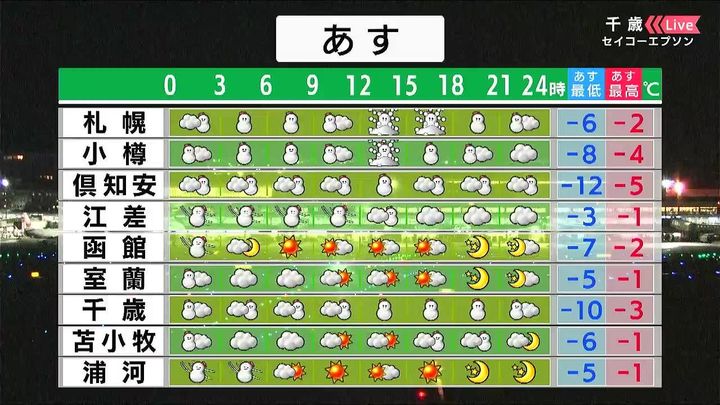 札幌や小樽は断続的に雪が降るでしょう。午後は短い時間で一気に積雪が増え、渋滞などが発生するおそれがあります。函館や浦河は日中は晴れるでしょう。