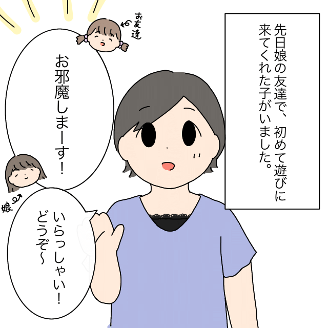先日、娘ちゃんの友達がお遊びに来てくれたと思い出すママ。「お邪魔しまーす!」「いらっしゃい!どうぞ~」と心良く出迎えました。