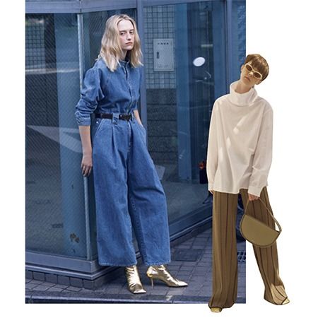 「右はニットパンツ、左はデニムとどちらも脱力感のあるボトムのため、引き締め役としてハンサムなゴールドを採用。インパクトを放つ色も、ロングボトムをかぶせればアクセサリー的に使えます」(スタイリスト・樋口かほりさん)