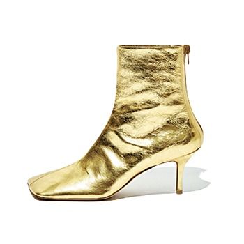 ゴールドショートブーツ(6.5)/PIPPICHIC(ベイジュ) 見た目にもわかるしなやかなヤギ革で、品のある派手さ。ヒールとは対照的に、つま先がスクエアトゥだからドレッシーになりすぎず合わせやすい。