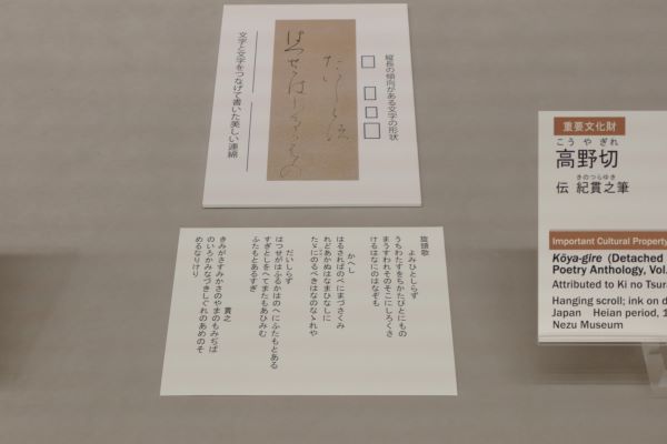 重要文化財 高野切(第三種) 文字の字形、連綿についての解説 ©根津美術館