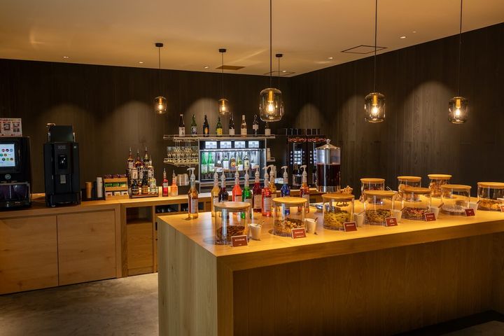 ホテルに到着してチェックインが済んだなら、暖炉が印象的なモダンなロビーラウンジでひと休み。無料で利用できるゲストラウンジにはビールやワイン、地酒など豊富なアルコールのラインナップに加え、小腹を満たすのにぴったりなスナック類も充実。16~18時の間はピクルスやフムスといったちょっとしたオードブルも提供されます。日中はカフェ、夜はバー感覚で利用できるので、好きな時間に思い思いに過ごして。