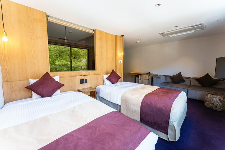 滞在中の満足度をよりUPするなら、デラックスツインルームにぜひ宿泊したいところ。2台並んだシングルの前の大きな窓からは、豊かな自然の風景が広がり解放感たっぷり。清々しい森の光景を眺めながらゆったりとくつろげる空間が、リラックスのひとときをいっそう上質に演出してくれます。