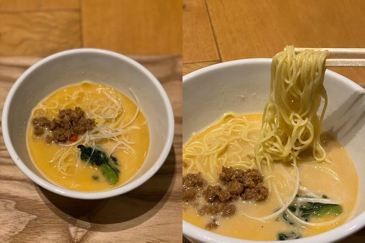 21:00~22:30までの間、宿泊者限定で1杯サービスしてくれるのが「地獄めぐり 夜鳴き坦々麺」。それぞれ味が異なる赤(四川坦々麺)、黒(黒ごま坦々麺)、白(四川坦々麺)の3つの地獄が月替わりで登場します。つるっと食べられる細麺で、小ぶりな丼で提供される坦々麺は、夜にちょっとだけ何か食べたいときにぴったり。