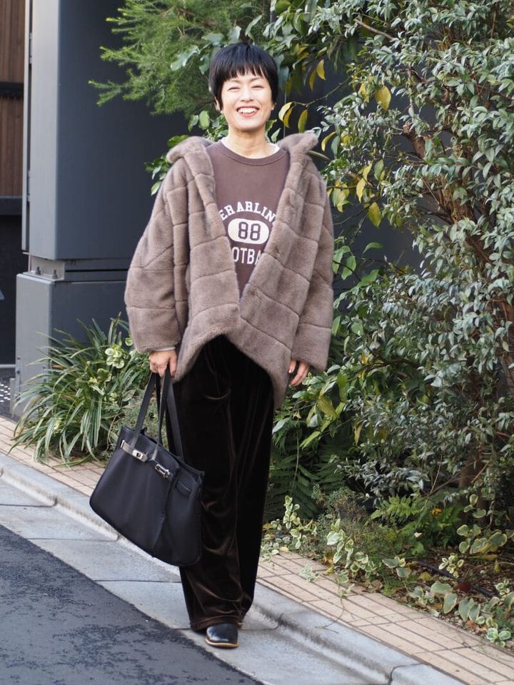 ヘアスタイルを変えてから、コーディネートの幅が広がったという吉田さん。「かっちりしたアイテムやゴージャスなアイテムも、ショートヘアだと自然とカジュアルダウンされるような気がして、手に取りやすくなりました」。この日はリラックス感のあるスウェットにファーコートを重ねて華やかに。大人の余裕がにじみ出る、力の抜けたスタイリングの完成です。