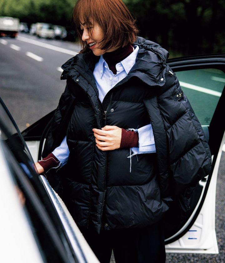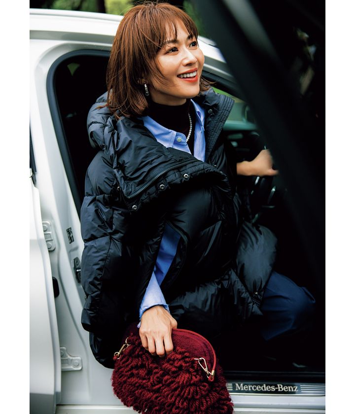 ダウンケープ¥126,500(タトラス/タトラス コンセプトストア 日比谷店)シャツ¥35,200(シー/エスストア)ニット¥25,300(ウィム ガゼット/ウィム ガゼット 玉川髙島屋S・C店)パンツ¥53,900(エイトン/エイトン青山)バッグ¥40,150(ヴィアメイルバッグ/ティースクエア プレスルーム)イヤリング¥8,800(アビステ)ネックレス¥22,000(ジゼルベー/ZUTTOHOLIC)