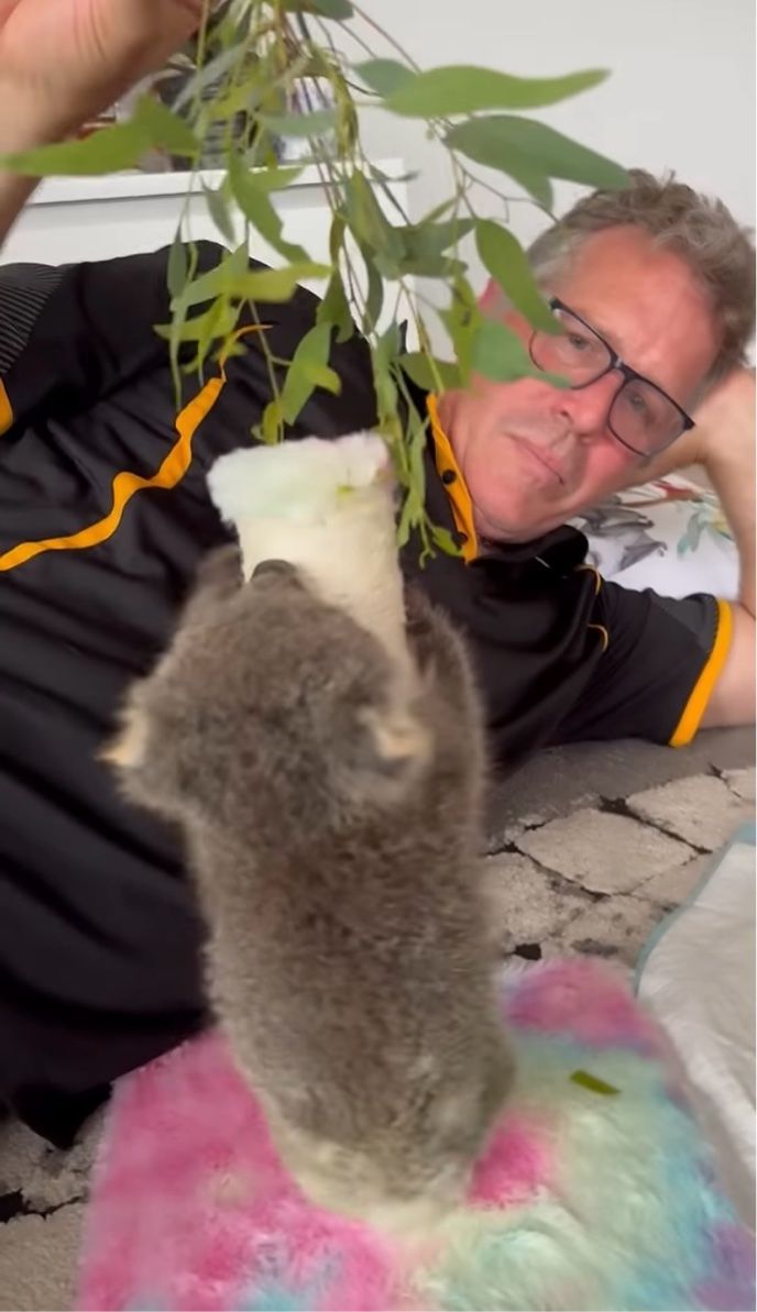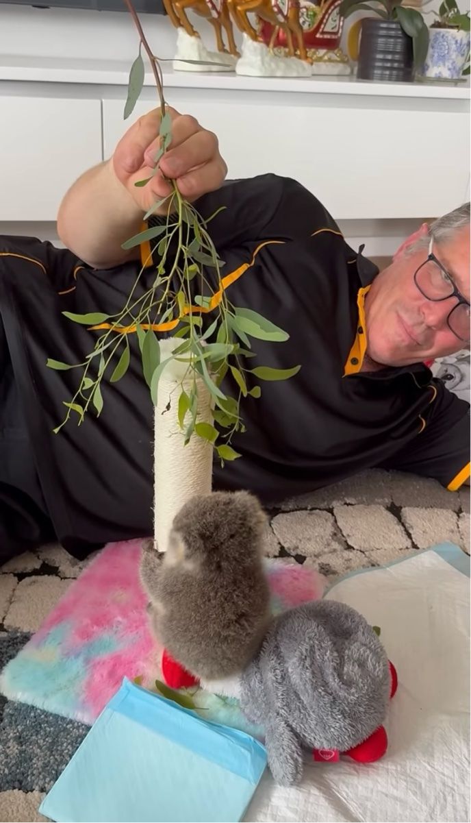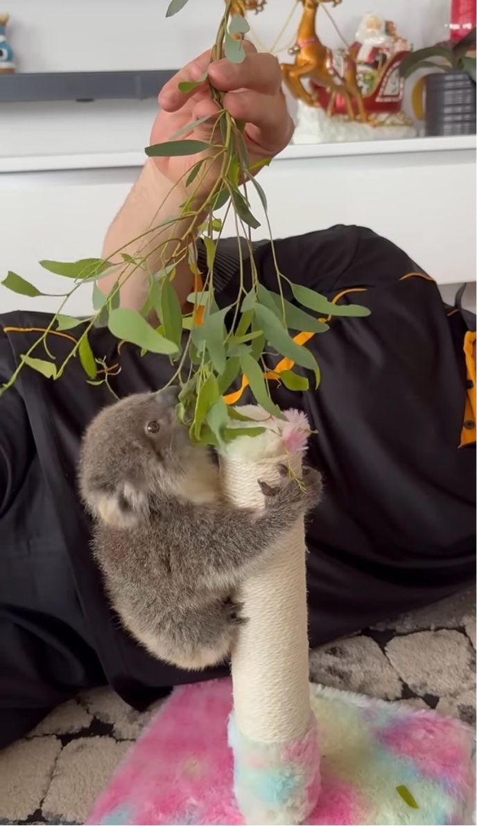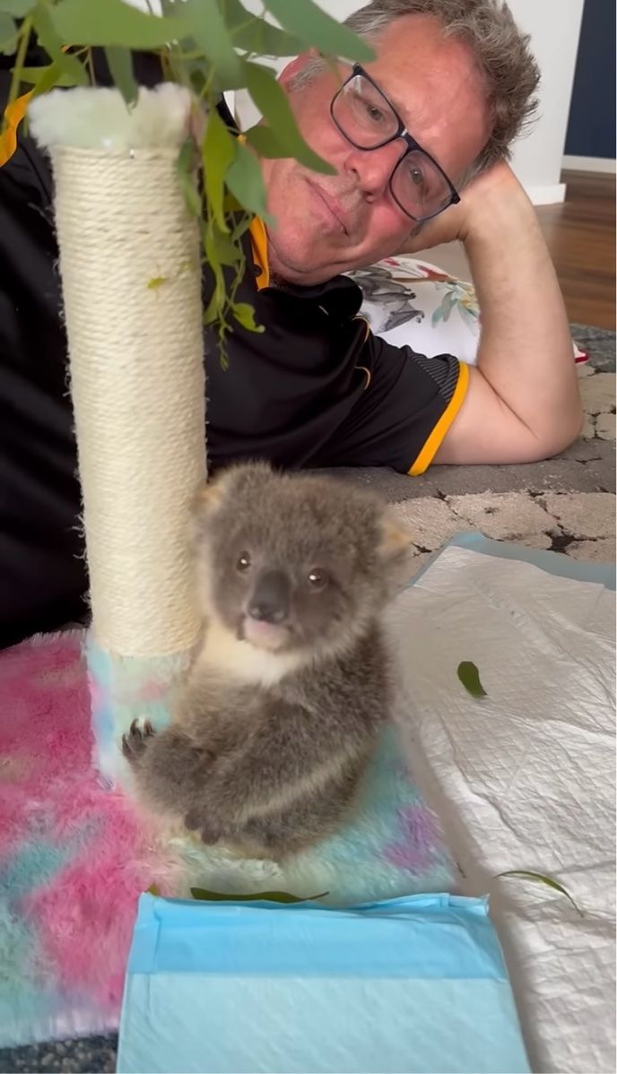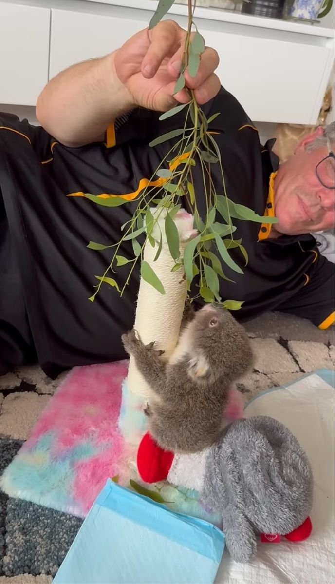 木に見立てたタワーにギュッとしがみついているのは、保護されたコアラの赤ちゃん『ルイーズ』。 この日、ルイーズは里親のブルースさんに応援されながら初めての木登りに挑戦していました。