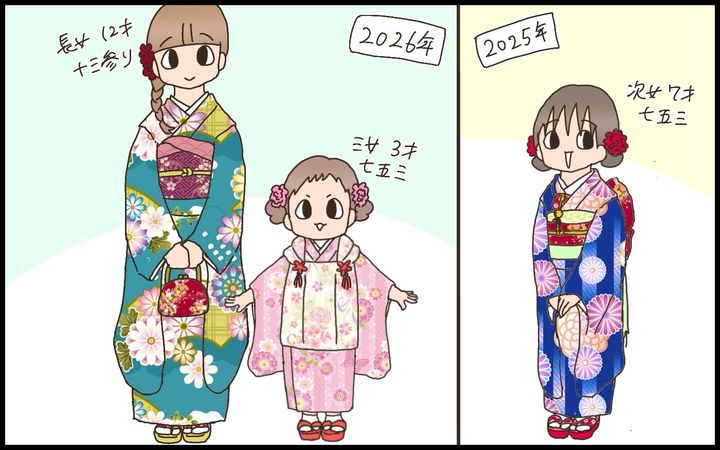 2歳でやったとしても数えで考えれば問題ないし、三女は体も大きいので着物のサイズも問題ないと思います。
