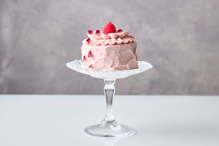 「薔薇と苺のショートケーキ」1300円は憧れを詰め込んだ魅惑のショートケーキです。上部にはエディブルフラワーのバラをトッピングしている、上品な一品になっています。ガラスのスタンドで提供されます。