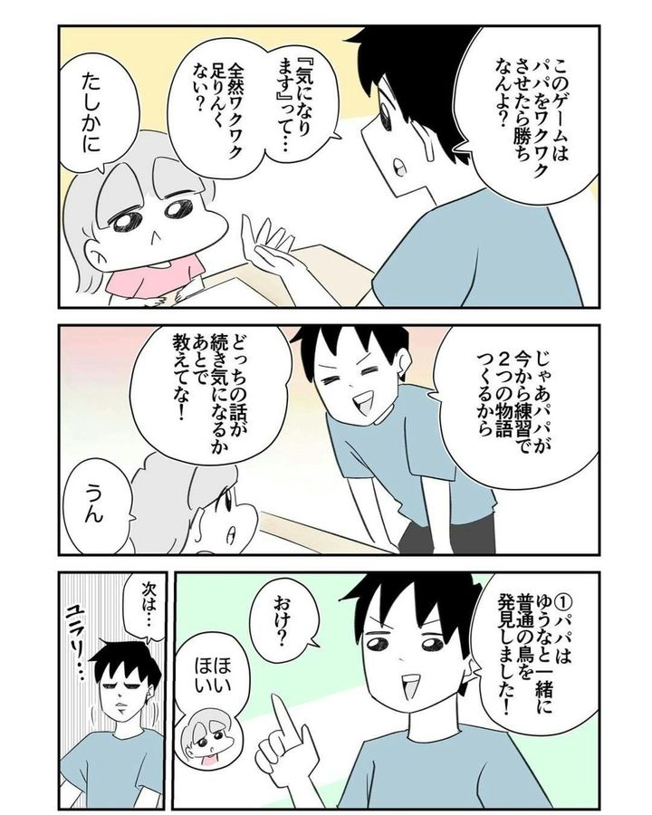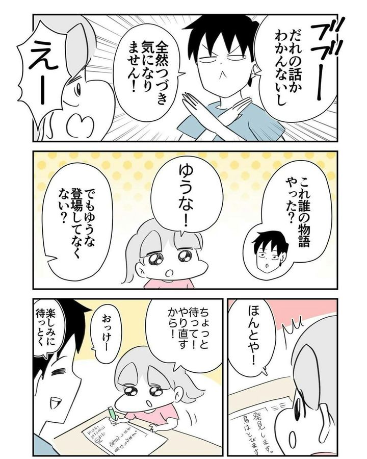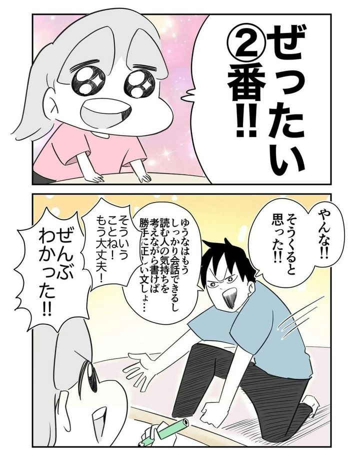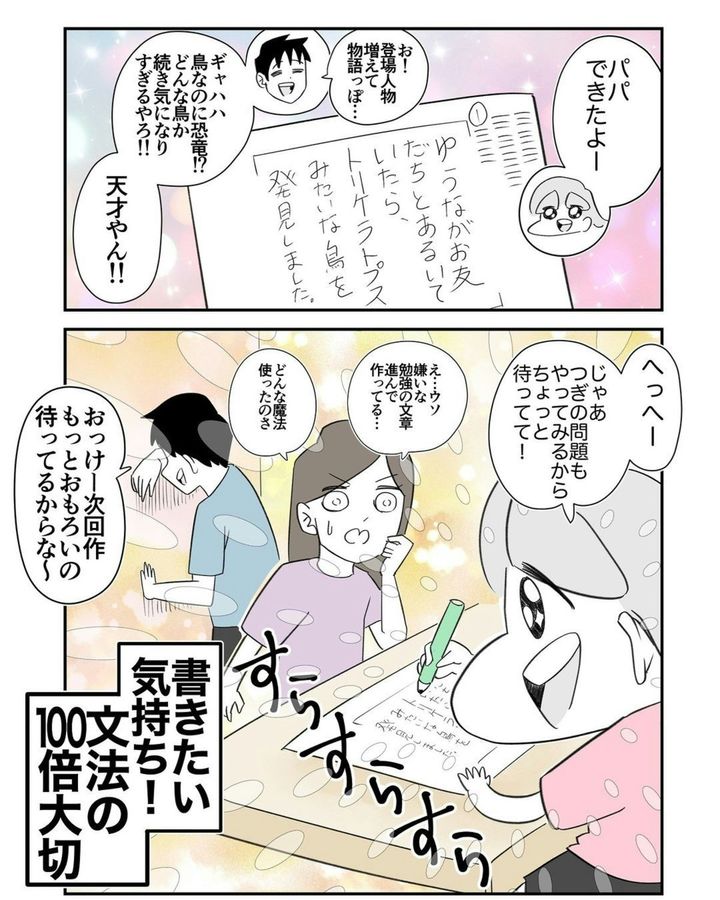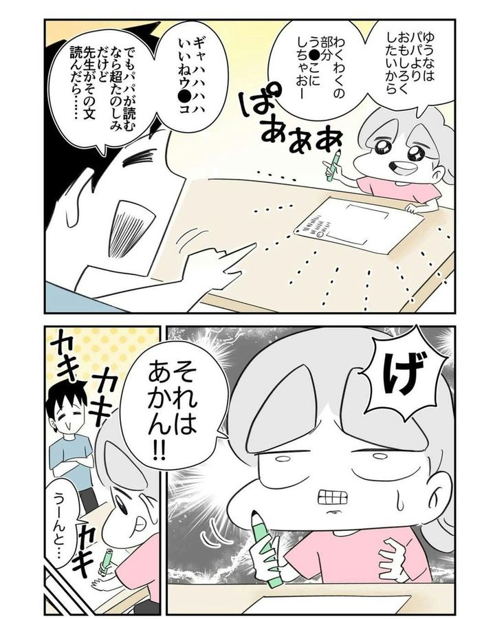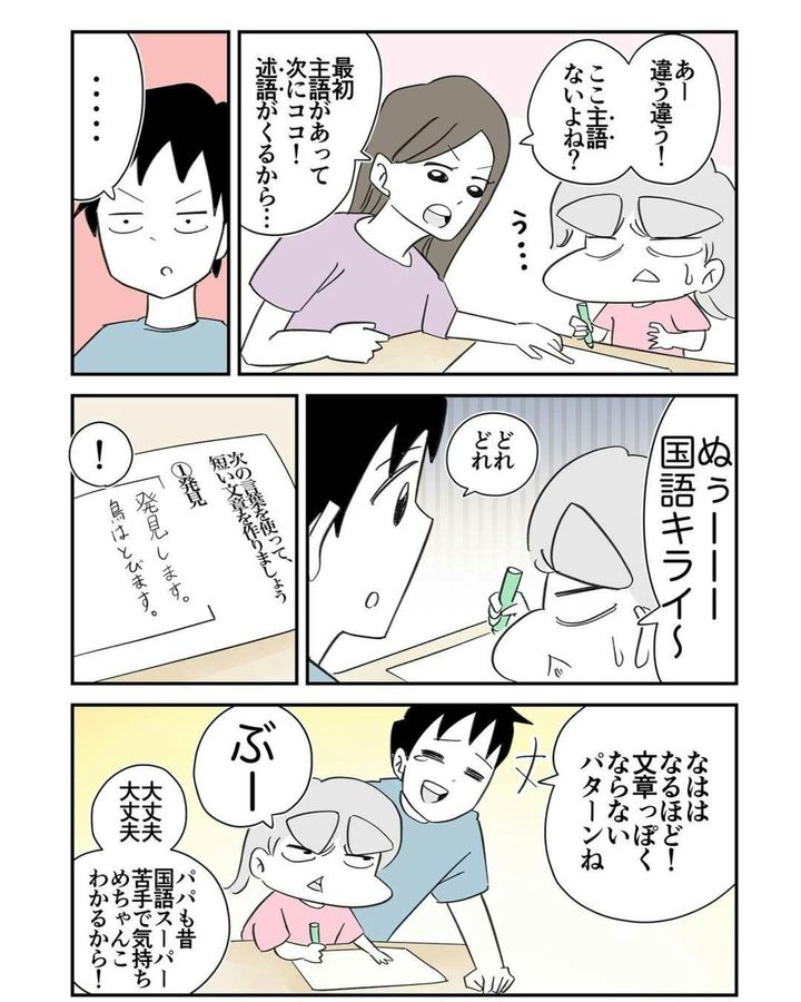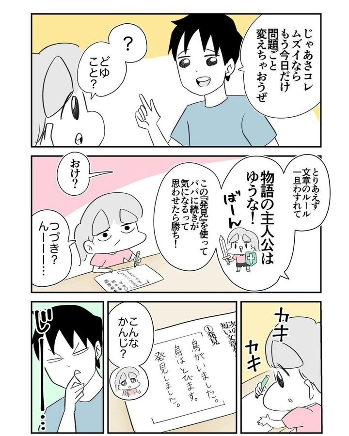 国語が苦手で、文章を作る宿題に苦戦しているこばぱぱ(@kobapapaaa)さんの娘・ゆうなちゃん。見かねたこばぱぱさんは、宿題にアレンジを加えてゲームにしてみることに。初めはうまくできなかったゆうなちゃんですが、こばぱぱさんのおもしろい話を聞いた結果…。『苦手を克服する方法』をごらんください。