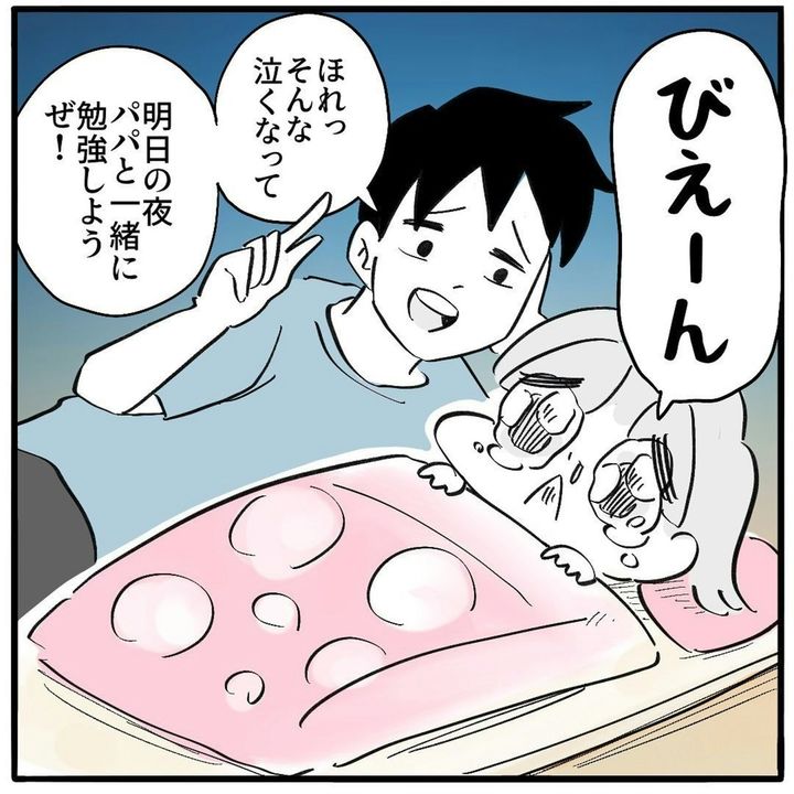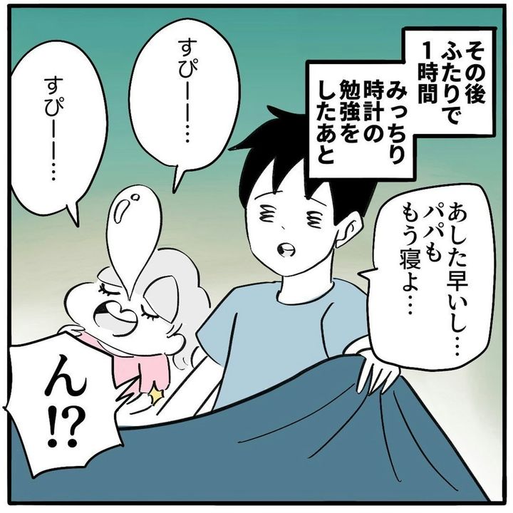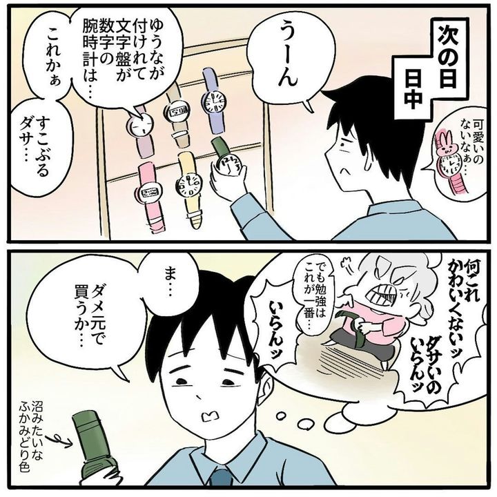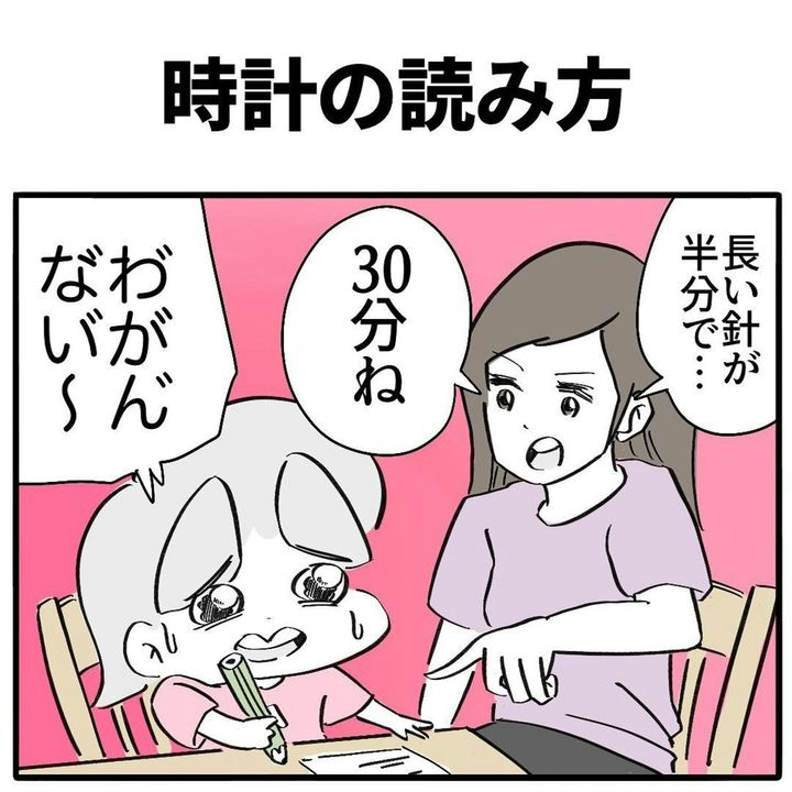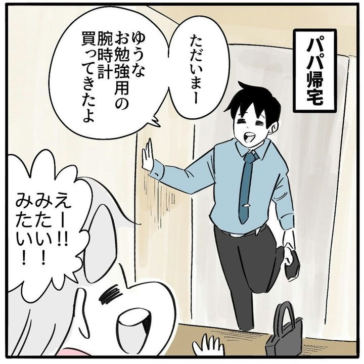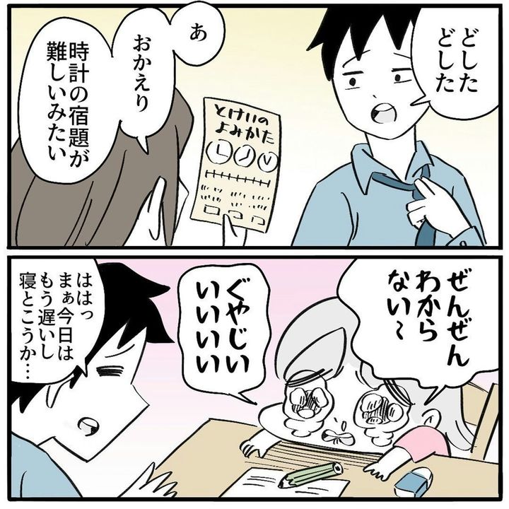作者・こばぱぱ(@kobapapaaa)さんの娘・ゆうなちゃんは時計の問題が苦手なようで、泣きべそをかきながら宿題をしていました。翌日、ゆうなちゃんのモチベーションを上げるために腕時計を探すこばぱぱさんですが、かわいいデザインのものがありません。ダメ元でダサい腕時計を買って帰ると…。『時計の読み方』をごらんください。
