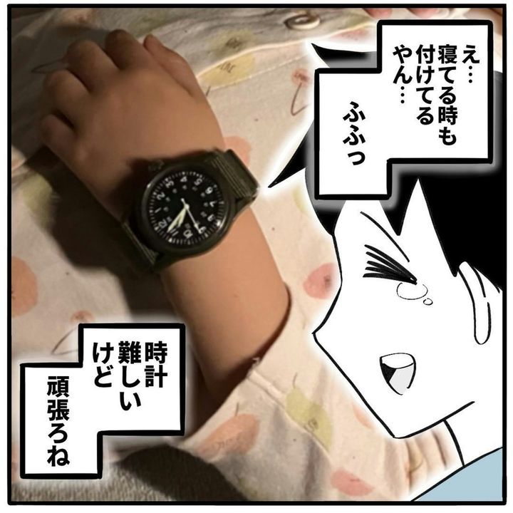 こばぱぱさんの予想に反し、満面の笑みでお礼を伝えるゆうなちゃん。娘を思うパパの気持ちもしっかり伝わっていて、心が温かくなるエピソードです。よほど気に入ったのか、寝る時も腕時計をつけていたそう。かわいらしいゆうなちゃんの行動に、とっても癒やされますね。