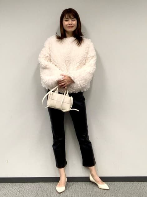 ホワイトボアにスッキリシルエットのキレイめなレザーパンツと合わせて今っぽい雰囲気にスタイリング。ワンツーコーデでもトレンド感ある着こなしを叶えます。甘くなりがちな白のモコモコトップスはシンプルなモノトーンコーデが◎。全体的に引き締まった印象の大人可愛いコーデに整います。小物もホワイトで統一して上品な清潔感もプラス。
