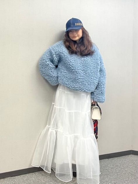 華やかなボリューム感に適度な丈感がどんなボトムスとの着こなしも叶える万能アイテム。チュールスカートをあわせてトレンド感あるスタイルに仕上げました。短丈なら甘すぎることなくカジュアルなお出かけコーデにぴったりです。