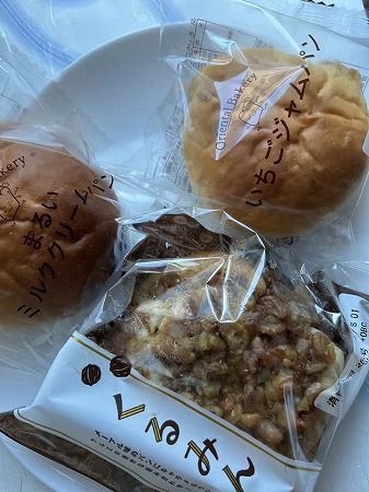 3個入りで300円でした。クルミがたっぷり入ってとても食べ応えがありました。ミルククリームパンといちごジャムパンも中身がぎっしり。菓子パンの他には食事パン、バームクーヘンやクッキーなどの焼き菓子が入っていることもあるそうです。