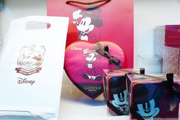 毎年恒例のゴディバとディズニーストアの共同企画商品の2025年バレンタインコレクション。ハートボックス(3,800円)他。 2025年はチョコレートを贈る側として紳士なイメージのミッキーで、大人っぽくロマンティックな雰囲気。