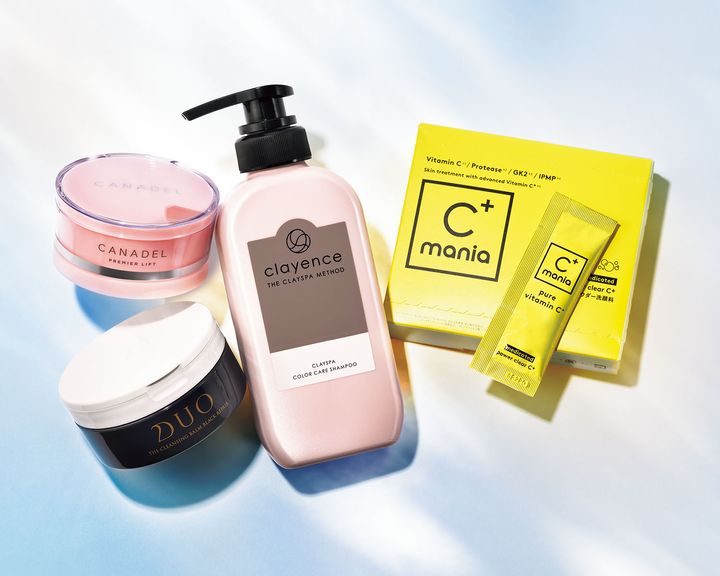 左上:カナデル プレミアリフト[医薬部外品]58g ¥4,180、左下:デュオ ザ クレンジングバーム ブラックリペア 90g ¥3,960、中:クレイエンス クレイスパ カラーケアシャンプー 300ml ¥2,750、右:C+mania 薬用パワークリアC+[医薬部外品]0.4g×30包 ¥2,420(すべてプレミアアンチエイジング)