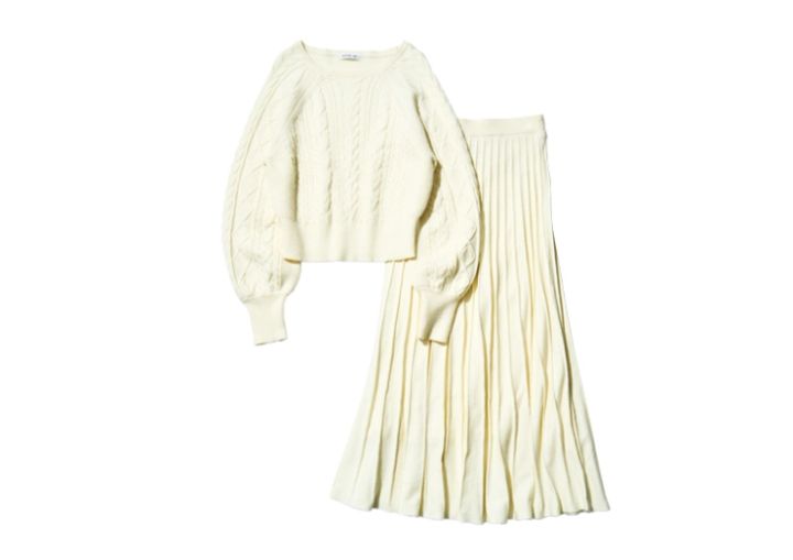 白ケーブル編みニットとフレアスカートのセットアップ¥15,994/NATURAL BEAUTY BASIC