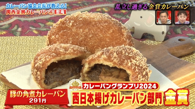 スタジオでは、なるみ・岡村に食べて欲し過ぎる金賞カレーパンとして、大丸心斎橋店に出店している「天然酵母造りのパンの店 聖庵」の 「豚の角煮カレーパン」(291円)を紹介。天然酵母を使っていることにより香りがよくて、口の中でほぐれる角煮と生地の甘味がスパイスと絡みあう絶妙なバランスのカレーパンだ。