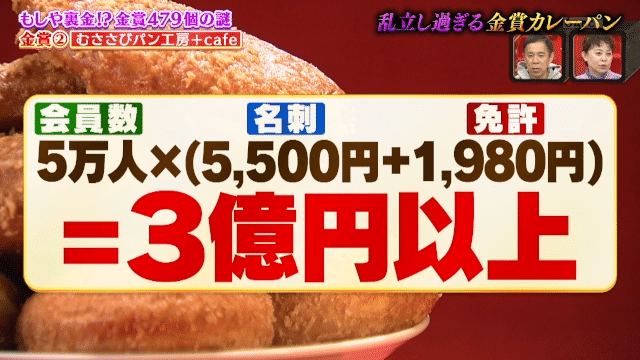 「金賞、最高ですね!」と笑顔で語る店員さん曰く、カレーパン協会の一般会員「カレーパンタジスタ」という人たちが全国に5万人以上いるらしい。協会に申請すると有料で名刺や免許を発行することができるという。仮に名刺の発行費5500円(100枚)と免許1980円を5万人の会員が発行すると3億円以上の売上に! さらに調査を進めるとバターや油など大企業のスポンサーの商品を使ったカレーパンで、金賞がもらえるスポンサー賞もあるという。