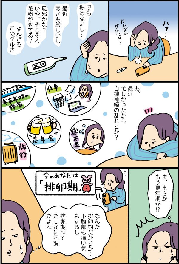 倦怠感があるなぁ…と思っても、自律神経の乱れなのか、生理前なのか、排卵日だからか…思いあたることが多すぎて、原因がわからないことが多い。熱が出て初めて風邪だった気づくこともあり、困っています(K.O)