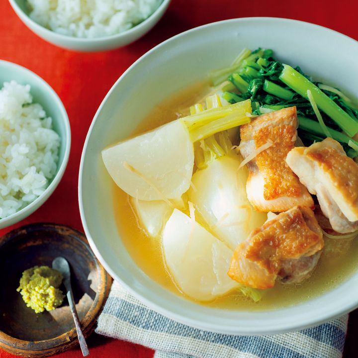 鶏肉を香ばしく焼き、かぶにうまみをしみ込ませてほろほろに煮た一品です。