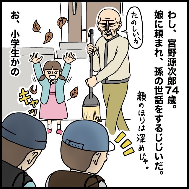 わし、宮野源次郎74歳。娘に頼まれ、孫の世話をするじじいだ。顔の彫りは深めじゃ。孫娘のキラリはとても可愛く、わしにもよく懐いてくれている。朝、孫と一緒に家の前の掃除をしていると登校中の小学生が通った。