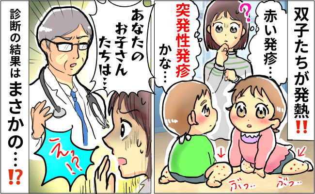 私は4歳の長女と、2歳の男女の双子を育てています。ある日、わが家の双子が発熱して発疹が出たので、「突発性発疹」だろうと思っていた私。しかし受診した結果、まさかの病名が判明したのです。