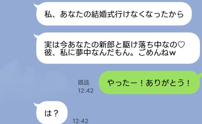 3. 「あなたの新郎と駆け落ち中なの♡ごめんね」と親友から略奪連絡。「ありがとう!実は…」真実を知らせた結果、2人の末路は