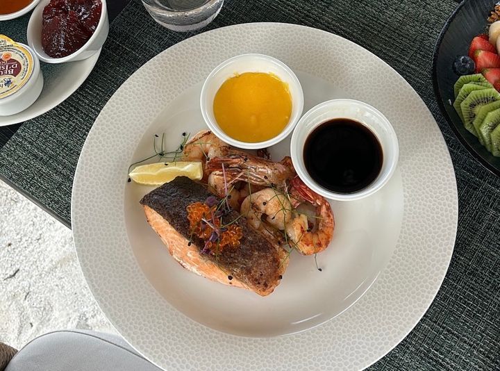 オーダーした、サーモンとエビのグリルがやってきました。ソースはオランデーズソースに加え、しょうゆも添えてくれる心遣いがうれしい!(涙)トップに添えられたイクラとしょうゆで、一気に日本を感じました。