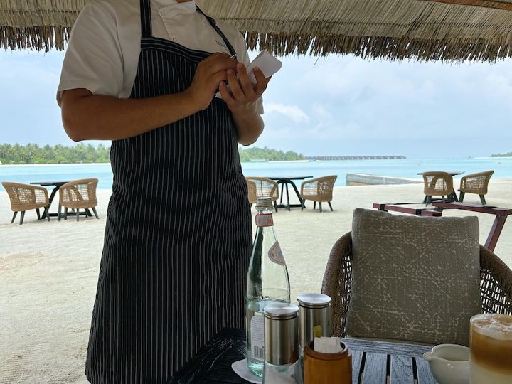 希望すれば、シェフ自らがオーダーを聞きにきてくれます。「ナラドゥ・プライベート・アイランド」の大きな魅力の一つが朝食。自分の食べたいメニューを何でもリクエストできる“no menu concept”というスタイルで、なんと好きなものを何でもオーダー可能!