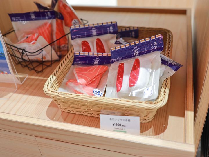 私が、気になりつつまだ購入したことがないのが、富山県高岡市「助野靴下」の「寿司ソックス」です。お腹が空いているときに見るとネタとシャリに見えてきそうな美味しそうなソックスは、実際に履いて使えるようになっています。意外にもリーズナブルな価格ですし、次回目にした際は買って履いてみたいです!!