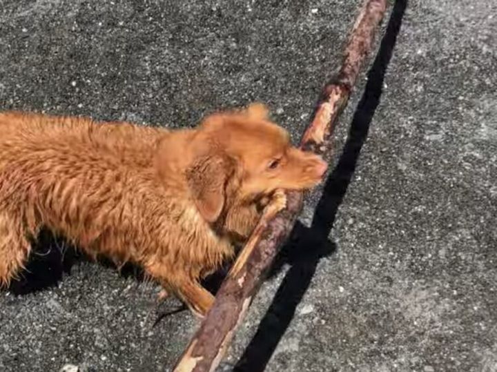 これで遊ぶには大きすぎるよ! 木の枝に大興奮の犬さん