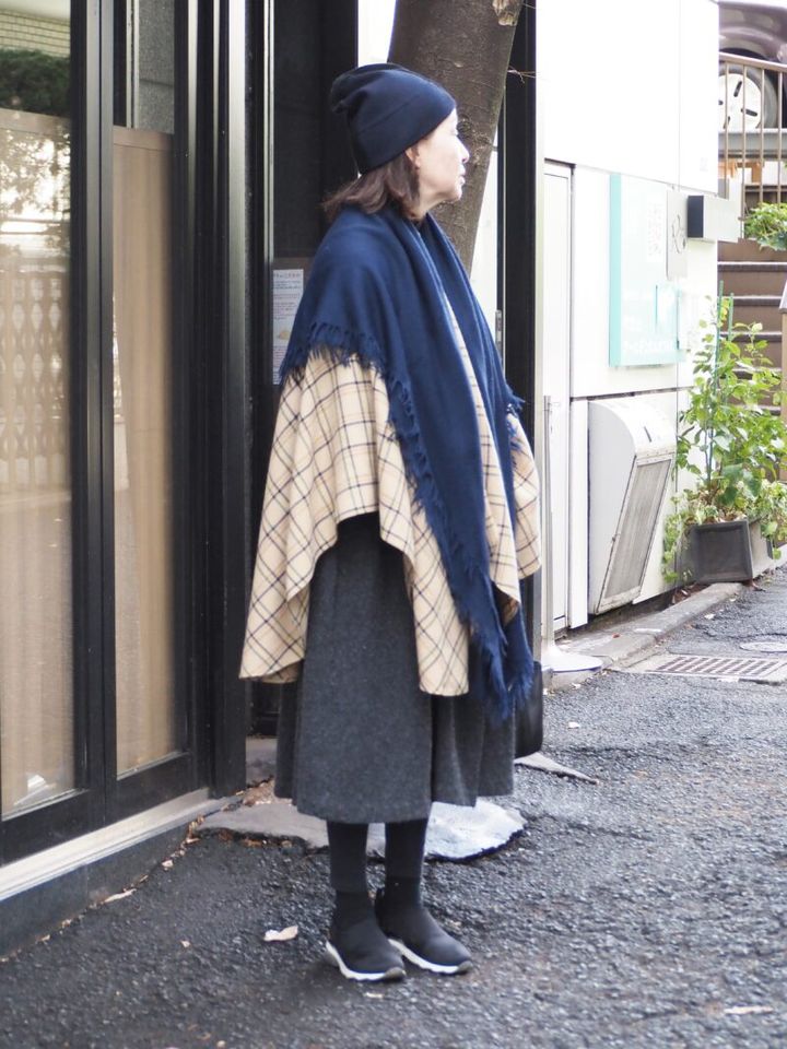 素材や縫製にこだわりをお持ちのデジレさん。「『コムデギャルソン』のウールスカートは、数年前からはいている冬の定番アイテムです。値段は高いけど、やはり質の良さは一流。日本のブランドでいちばん好きですね」。ストールとケープを重ね、英国マダムのようなクラシカルな装いに。