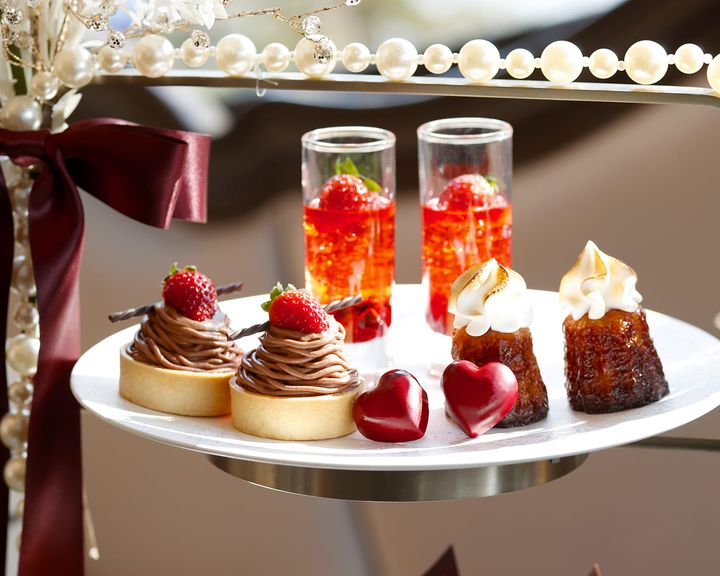 艶めく濃厚なショコラに、旬の真っ赤ないちごが映える華やかなアフタヌーンティーが、上品なパールをまとった冬の装いで登場。スイーツは、つやっとしたなめらかなチョコレートムースや、チョコレートモンブランにいちごを丸ごと1つ忍ばせたタルト、真紅のハート型ボンボンショコラやベリーとシャンパンを合わせたゼリーなど、旬の甘酸っぱいいちごと濃厚なチョコレートの相性抜群な組合せを楽しむ7種がラインアップ。セイボリーは、いちごをのせたカリフラワーのムースや、いちごのヴィネグレットソースがアクセントとなる旨味が凝縮されたTAVERN特製ミニバーガーなど4種に加え、牛すじ肉のあたたかいボルシチやスモーク鴨といちごのサラダも揃えた、旬食材たっぷりのヘルシーかつ満足感溢れる内容。飲み物はシンガポール創業のラグジュアリーティーブランド TWG Teaの紅茶など全16種類を好きなだけどうぞ。また、お酒とともに楽しめるよう、フレッシュのいちごにローズシロップと花びらを入れ、シャンパンを注いだエレガントなカクテルもオプションで登場します。さらに、お食事もアフタヌーンティーも両方楽しみたい人には、コースの最後にミニサイズのアフタヌーンティーが付いたプランを。