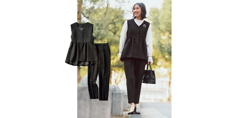 高級感のあるダブルクロス生地を使用。インに合わせるもの次第で、シンプルも甘めも自在に楽しめるペプラムジレとパンツのセット。
