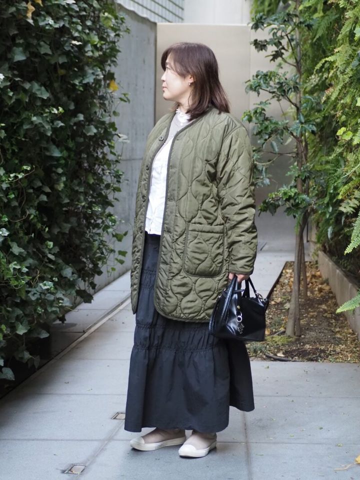 白と黒を2色買いしたという「チャオパニック」のギャザースカートは、ちあきさんのベストバイ。「甘めのアイテムが好きですが、全身そろえるとガーリーになり過ぎるので、カジュアルなアイテムでバランスを取るように心がけています」。この日はカーキのキルティングジャケットとスニーカーで、家族そろってお出かけへ。