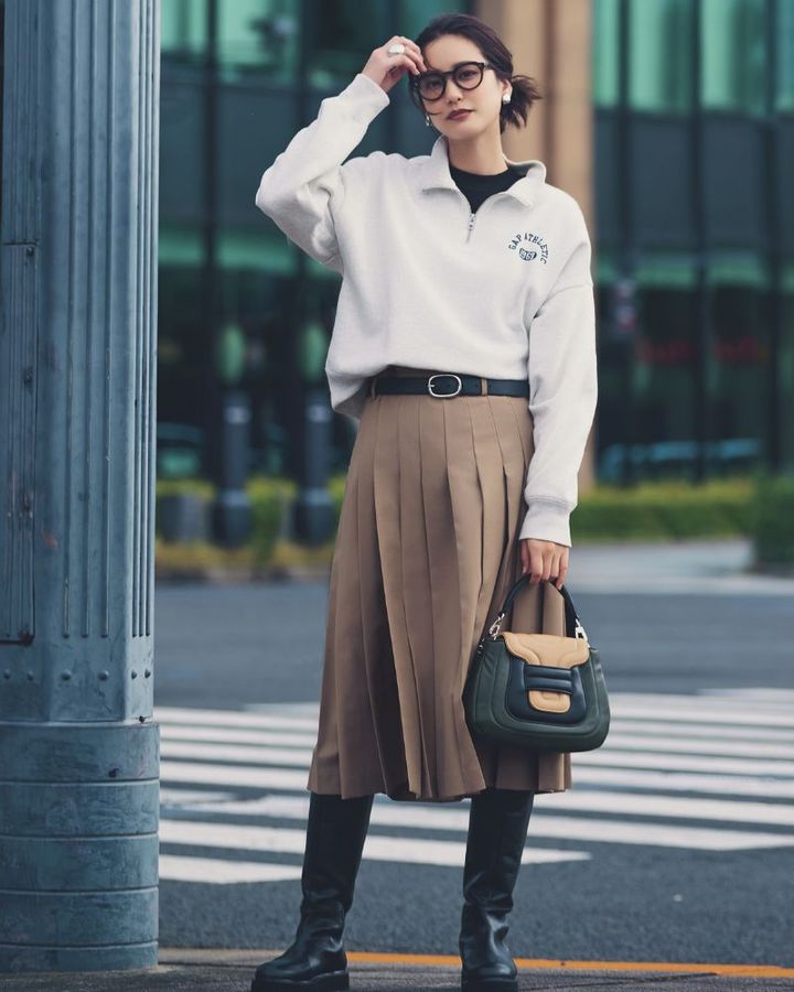1月18日(土)、王道のトラッドコーデは、古風に見えないよう毎年変化をつけるのが必須。どこか懐かしさのあるミモレ丈のプリーツスカートは、ほっこりしないよう旬なアイテムと合わせるとうまくいきます。あえて対極な印象のハーフジップスウェットを投入すれば、コントラストが効いて今っぽく。ほっこり見えを回避するため、レザーアイテムを細部に散りばめて、スタイリッシュに仕上げるのがポイントです。