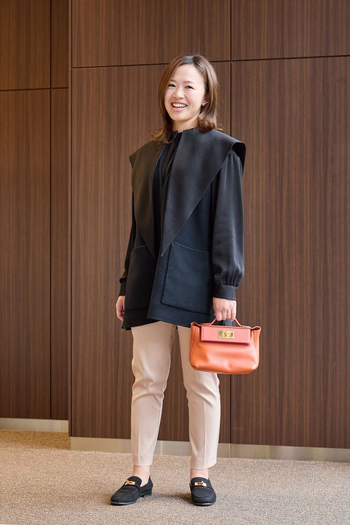 「気が付いたらモノトーンの服ばかり選んでしまうので、ポイントになる小さいキレイ色バッグを探していたところに出合いました。子どもと一緒のときには避け、友人とのランチなど特別な日に大切に使っています」佐藤成美さん/34歳・159㎝・病院勤務(1歳の男の子ママ)
