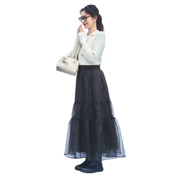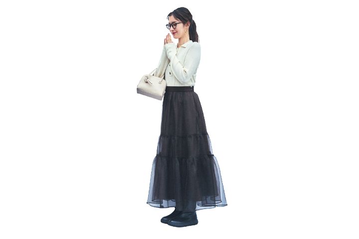 ティアードのオーガンジー素材で、ワントーンコーデにもたちまち表情がつけられる!¥20,900(アルページュストーリー プレスルーム)