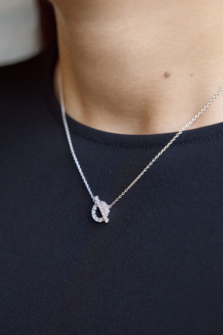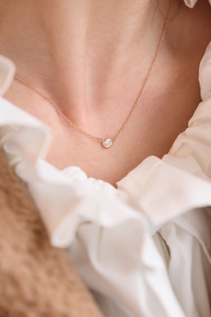 「結婚10周年の記念で購入した一粒ネックレス。ダイヤの大きさやカットの違うものをいろいろ見せてもらうために何度もお店に通い、納得のいくものを選びました。コーデを選ばないシンプルなデザインなので、ブラウスからTシャツ、ピラティスウエアのときにも付けています」伊藤 優さん/38歳・メーカー勤務(13歳と9歳の男の子ママ)