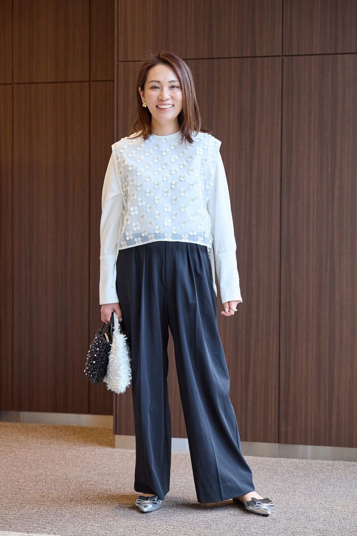 「10年ほど前に購入したティファニー T スマイルはシンプルなのに存在感があり、オンでもオフでも使えるので愛用しています。無地はもちろん、花柄のジレに合わせてもしっくりくる懐の広いネックレスです」石川菜生さん/40歳・歯科衛生士(11歳と8歳と5歳の女の子ママ)