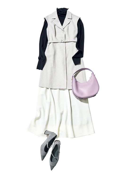 ウエストマークできるジレをナロースカートに重ね、上品な美人感を醸し出して。足元はブーツよりパンプスで、女性ならではの華奢さを演出。