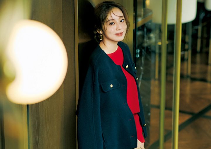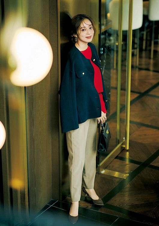 赤ニットだけで十分華やかだから、アクセは耳元だけに抑えて控えめに。テーパードパンツがコンサバになりすぎないよう、トレンドのジャコットを羽織ってこなれ感を出してみて。