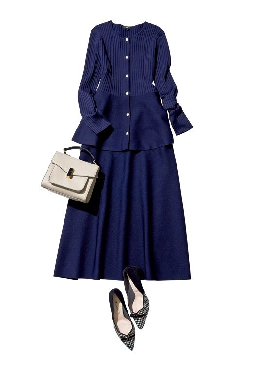 ネイビーできちんとした女性像を、柔和なニットで親しみやすさを演出。ウエストから上はフィットするリブなので、女性らしいライン見せも叶えます。