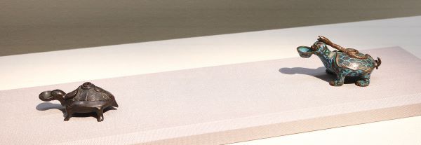 左から、玄武水滴 江戸時代・18~19世紀 銅製、鋳造、彫金、玄武七宝水滴 中国 清~中華民国時代・19世紀~20世紀 銅鋳造、彫金、鍍金 どちらも渡邊豊太郎氏・渡邊誠之氏寄贈 東京国立博物館蔵